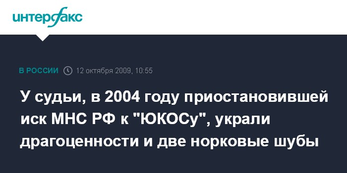 У судьи, в 2004 году приостановившей иск МНС РФ к "ЮКОСу", украли драгоценности и две норковые шубы