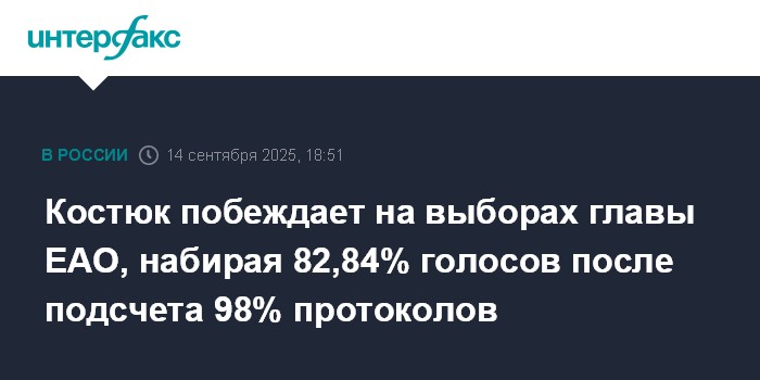 Костюк побеждает на выборах главы ЕАО, набирая 82,84% голосов после подсчета 98% протоколов