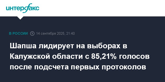 Шапша лидирует на выборах в Калужской области с 85,21% голосов после подсчета первых протоколов