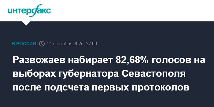 Москва. 14 сентября. INTERFAX.RU - Действующий глава Севастополя Михаил Развожаев (от партии "Единая Россия") лидирует на выборах губернатора с 82,68% голосов по итогам обработки 5,91% протоколов, следует из данных ЦИК РФ.