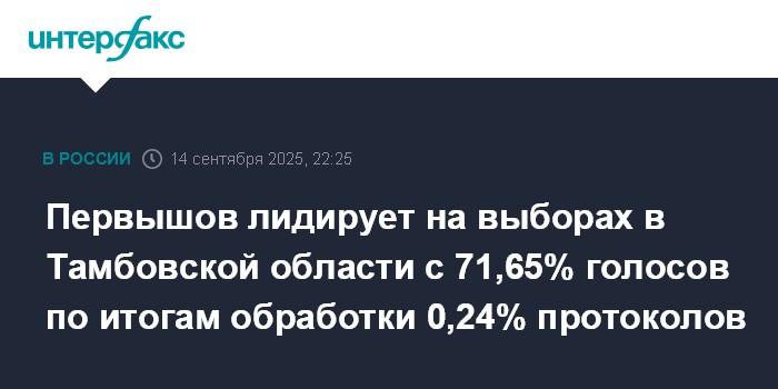 Москва. 14 сентября. INTERFAX.RU - Врио губернатора Тамбовской области Евгений Первышов ("Единая Россия") лидирует на выборах главы региона с 71,65% голосов по итогам обработки 0,24% протоколов, следует из данных ЦИК РФ.