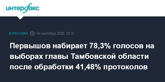 Москва. 14 сентября. INTERFAX.RU - Врио главы Тамбовской области Евгений Первышов ("Единая Россия") лидирует на досрочных выборах главы региона с 78,3% голосов по итогам обработки 41,48% протоколов, следует из данных ЦИК РФ.