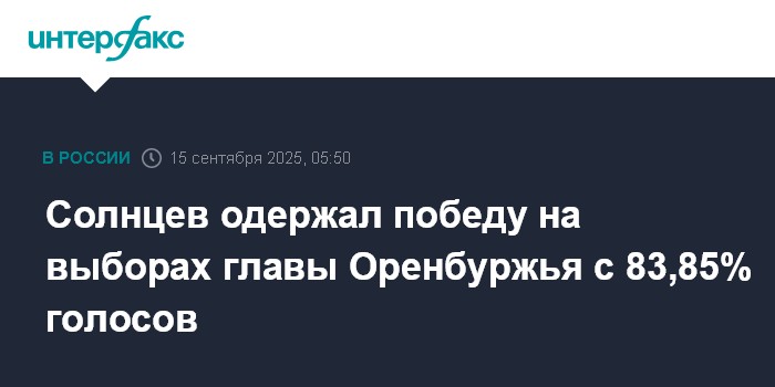 Москва. 15 сентября. INTERFAX.RU - По результатам обработки 100% бюллетеней на досрочных выборах губернатора Оренбургской области победу одержал врио губернатора региона Евгений Солнцев ("Единая Россия") с 83,85% голосов, следует из видеотрансляции ЦИК России.