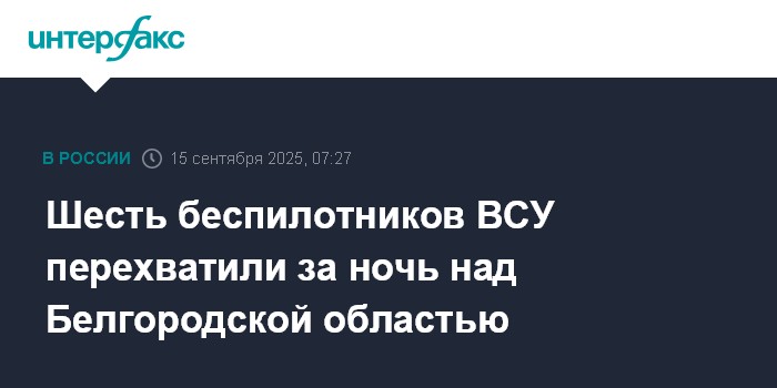 Москва. 15 сентября. INTERFAX.RU - Российские военные в ночь на понедельник перехватили и уничтожили шесть украинских БПЛА над Белгородской областью, сообщили в Минобороны России.