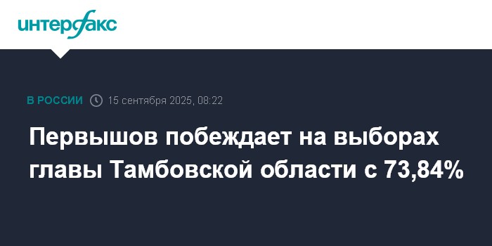 Москва. 15 сентября. INTERFAX.RU - Врио главы Тамбовской области Евгений Первышов ("Единая Россия") одерживает победу на выборах главы региона, набрав 73,84% голосов по итогам обработки 100% протоколов, следует из данных ЦИК РФ.