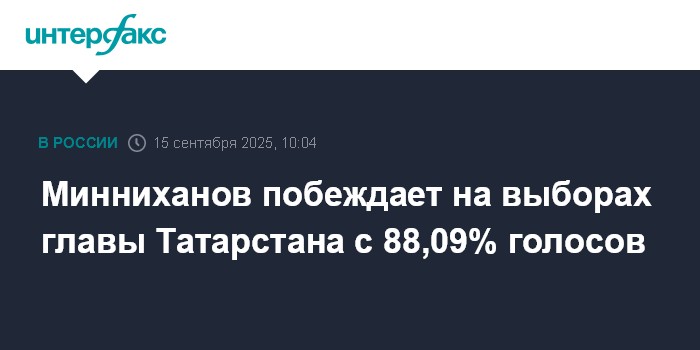 Москва. 15 сентября. INTERFAX.RU - Действующий глава Татарстана Рустам Минниханов (от партии "Единая Россия") побеждает на выборах главы региона с 88,09% голосов по итогам обработки 100% протоколов, следует из данных ЦИК РФ.