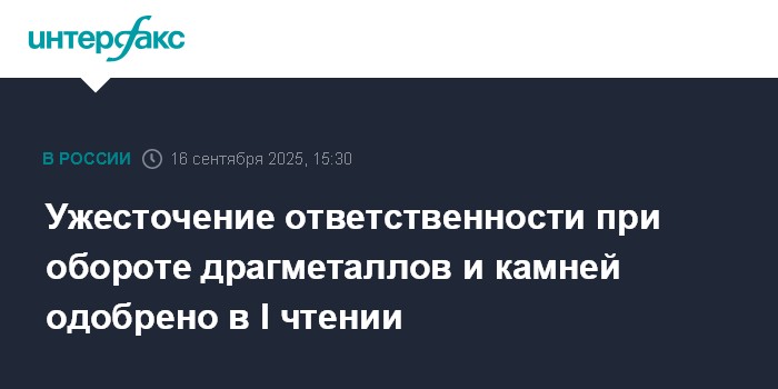 Москва. 16 сентября. INTERFAX.RU - Госдума приняла в первом чтении законопроект, который усиливает административную ответственность за повторные нарушения в сфере оборота драгоценных металлов и драгоценных камней (ДМДК).