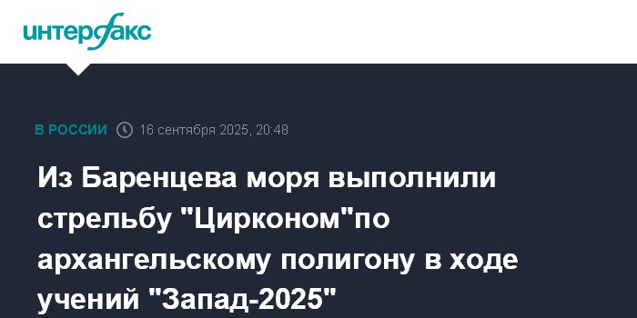 Из Баренцева моря выполнили стрельбу "Цирконом"по архангельскому полигону в ходе учений "Запад-2025"