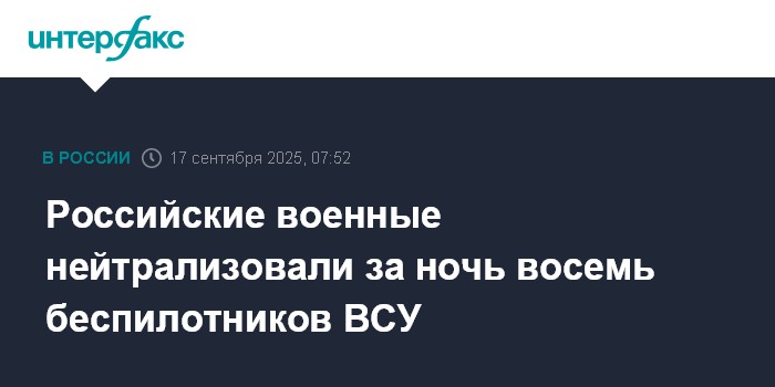 Москва. 17 сентября. INTERFAX.RU - Минобороны РФ сообщило, что дежурными средствами ПВО в ночь на среду перехвачено и уничтожено восемь украинских беспилотников над четырьмя российскими регионами.