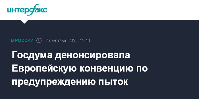 Москва. 17 сентября. INTERFAX.RU - Госдума денонсировала Европейскую конвенцию по предупреждению пыток и бесчеловечного или унижающего достоинство обращения или наказания.