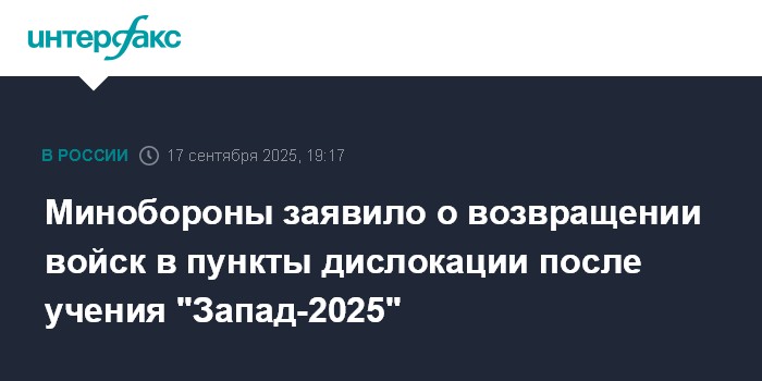 Москва. 17 сентября. INTERFAX.RU - Российские войска и подразделения других стран начали возвращаться в пункты постоянной дислокации после завершения стратегического учения "Запад-2025", сообщило Минобороны РФ в среду.