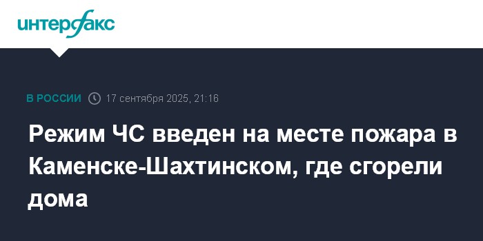 Москва. 17 сентября. INTERFAX.RU - Локальный режим ЧС введен в городе Каменск-Шахтинский Ростовской области на пострадавшей от пожара территории, сообщил губернатор региона Юрий Слюсарь в своем телеграм-канале.
