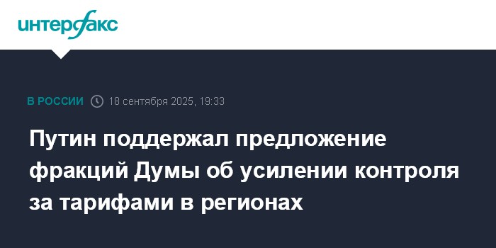 Москва. 18 сентября. INTERFAX.RU - Президент РФ Владимир Путин поддержал озвученное руководителями думских фракций предложение об усилении парламентского контроля за формированием тарифов в регионах, заявил председатель Госдумы Вячеслав Володин.