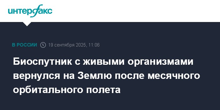 "Космический аппарат был запущен с Байконура 20 августа - спустя 30 суток он вернулся на Землю с живыми организмами на борту", - говорится в сообщении, опубликованном в телеграм-канале госкорпорации.