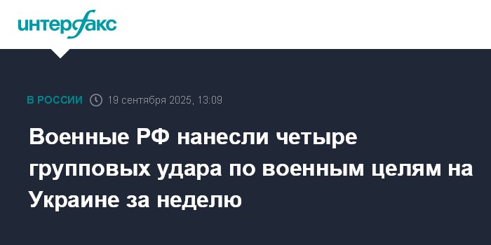 Москва. 19 сентября. INTERFAX.RU - Вооружённые силы России за неделю нанесли четыре групповых удара высокоточным оружием и ударными беспилотниками по объектам энергетической, топливной и транспортной инфраструктуры Украины, использовавшиеся в интересах украинской армии, сообщило министерство обороны РФ в пятницу.
