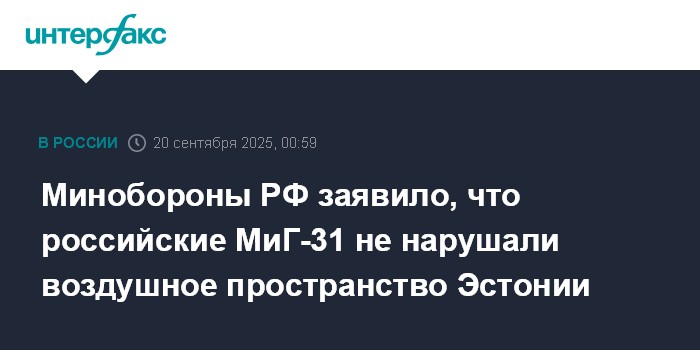 Москва. 20 сентября. INTERFAX.RU - Минобороны России заявило, что три российских истребителя МиГ-31 совершили в пятницу плановый перелет из Карелии в Калининградскую область, полет выполнен согласно международным правилам, нарушения воздушного пространства Эстонии не было.