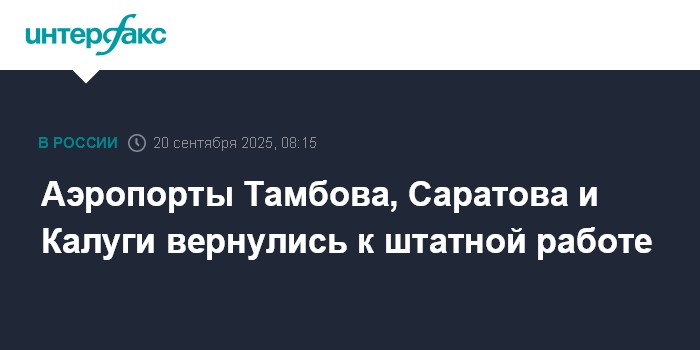 Москва. 20 сентября. INTERFAX.RU - Ограничения сняты в аэропортах Тамбова, Саратова и Калуги, сообщили в Росавиации.
