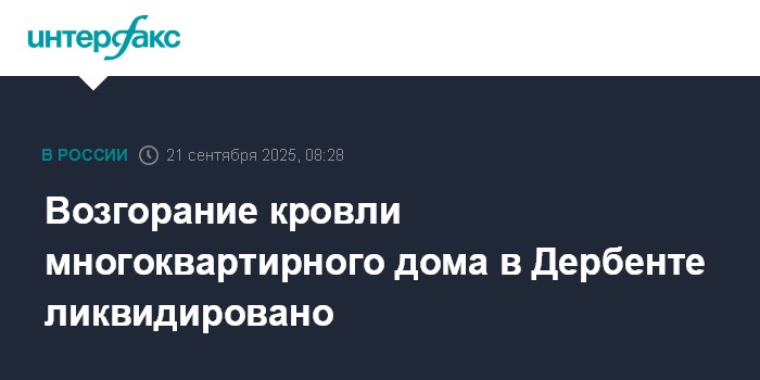 Москва. 21 сентября. INTERFAX.RU - Пожарные полностью ликвидировали возгорание кровли девятиэтажного дома в дагестанском Дербенте, жертв и пострадавших нет, сообщает в воскресенье пресс-служба ГУ МЧС России по республике.