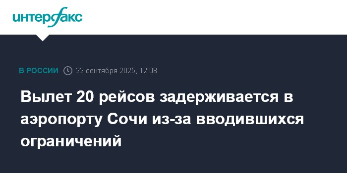 Москва. 22 сентября. INTERFAX.RU - Вылет 20 рейсов задерживается в международном аэропорту Сочи в связи с ограничениями, которые вводились в воскресенье для обеспечения безопасности полетов гражданских воздушных судов, сообщается в телеграм-канале аэропорта.