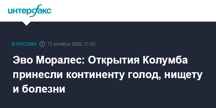 Ла-Пас. 12 октября. INTERFAX.RU - Открытие для европейцев Америки Христофором Колумбом принесло на континент "голод, нищету и болезни". С такими словами выступил в понедельник в день 517-ой годовщины этого события президент Боливии Эво Моралес Айма.
