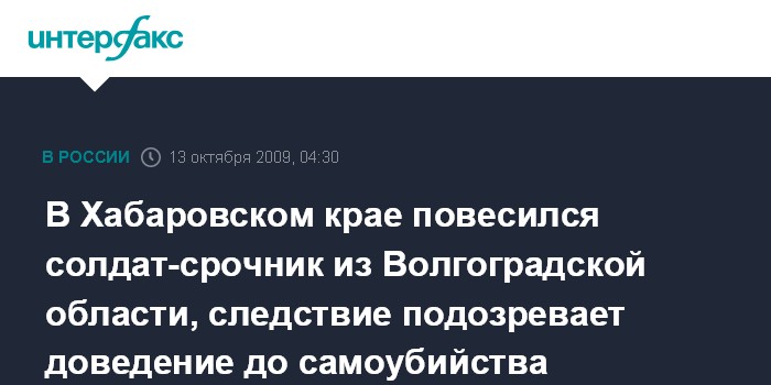 Хабаровск. 13 октября. ИНТЕРФАКС - ДАЛЬНИЙ ВОСТОК - В Хабаровском крае расследуют обстоятельства самоубийства солдата-срочника из Волгоградской области Дениса Костенко, который был найден повешенным недалеко воинской части в районе поселка Красная Речка 10 октября.