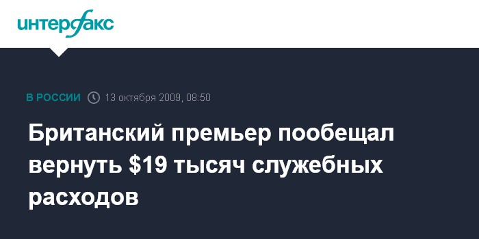 Москва. 13 октября. INTERFAX.RU - Премьер-министр Великобритании Гордон Браун объявил, что он вернет более 12 тыс. фунтов стерлингов (около $19 тыс.), полученных им в прошлом в качестве компенсации за различные служебные расходы. Деньги должны быть возвращены, поскольку независимый аудитор счел подобные компенсации необоснованными, сообщает ВВС.