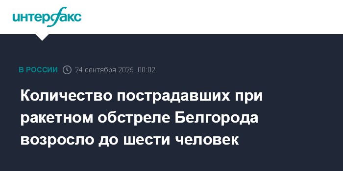Москва. 23 сентября. INTERFAX.RU - До шести человек возросло число пострадавших в результате ракетного обстрела Белгорода, сообщил губернатор региона Вячеслав Гладков.