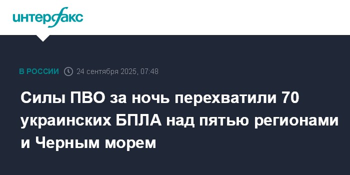Москва. 24 сентября. INTERFAX.RU - В ночь на среду российские военные перехватили и уничтожили 70 украинских беспилотников над пятью регионами и Черным морем, сообщило Минобороны РФ.