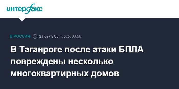 Москва. 24 сентября. INTERFAX.RU - В Таганроге в результате атаки БПЛА повреждены несколько многоквартирных домов, сообщил губернатор Ростовской области Юрий Слюсарь.