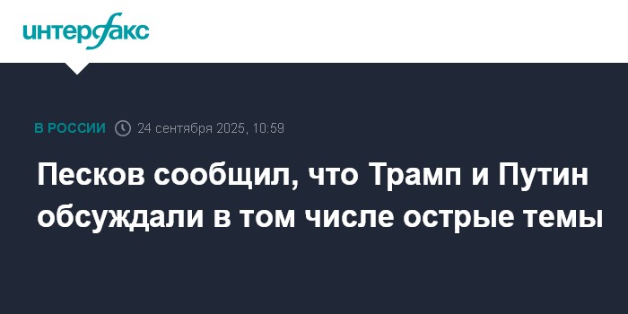 Москва. 24 сентября. INTERFAX.RU - Уровень отношений президентов России и США Владимира Путина и Дональда Трампа позволяет им обсуждать острые темы, включая Украину, заявил радио РБК пресс-секретарь главы российского государства Дмитрий Песков.