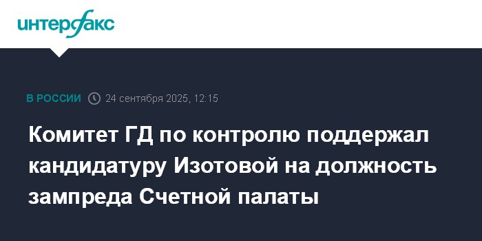Москва. 24 сентября. INTERFAX.RU - Комитет Госдумы по контролю на заседании в среду поддержал кандидатуру Галины Изотовой на должность заместителя председателя Счетной палаты Российской Федерации, сообщил первый замруководителя фракции "Справедливая Россия - За правду", первый зампред комитета Дмитрий Гусев.