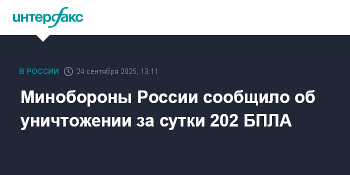Москва. 24 сентября. INTERFAX.RU - За сутки российские военные сбили 202 украинских беспилотника.