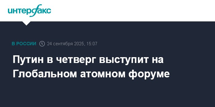 Москва. 24 сентября. INTERFAX.RU - Президент РФ Владимир Путин 25 сентября выступит на Глобальном атомном форуме, приуроченном к 80-летию атомной промышленности России, сообщила в среду пресс-служба Кремля.