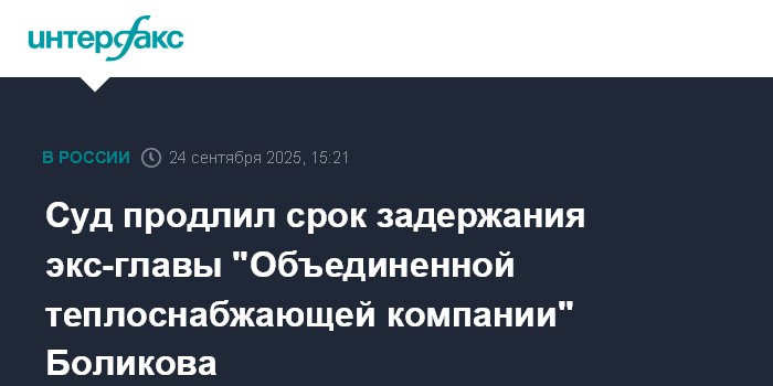 Москва. 24 сентября. INTERFAX.RU - В Екатеринбурге Верх-Исетский районный суд Екатеринбурга продлил срок задержания бывшего руководителя "Объединенной теплоснабжающей компании" (дочерняя компания "Облкоммунэнерго") Антона Боликова, сообщил корреспондент "Интерфакса" из зала суда.
