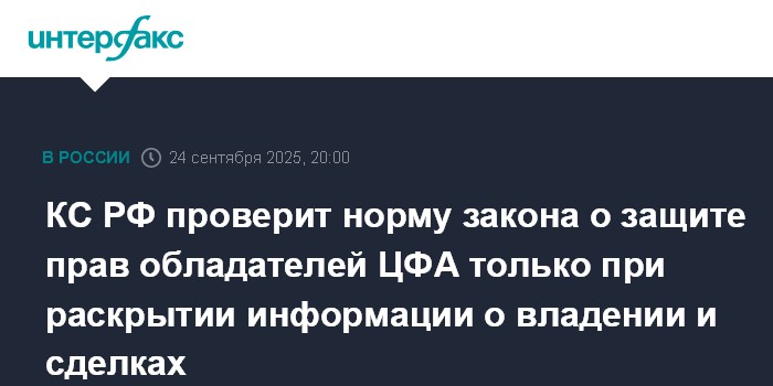 Москва. 24 сентября. INTERFAX.RU - Конституционный суд РФ решит, соответствует ли Конституции часть 6 статьи 14 закона "О цифровых финансовых активах", которая устанавливает, что требования лиц, владеющих криптовалютой и другим подобным имуществом, подлежат судебной защите только при условии, если они информируют о факте обладания и сделках.