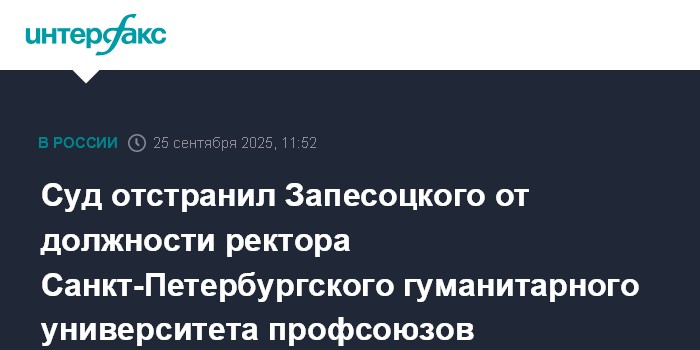 Москва. 25 сентября. INTERFAX.RU - Арбитражный суд Санкт-Петербурга и Ленинградской области определил отстранить от должности ректора Санкт-Петербургского гуманитарного университета профсоюзов (СПбГУП) Александра Запесоцкого в качестве обеспечительных мер по иску Генеральной прокуратуры к вузу и Федерации независимых профсоюзов России (ФНПР) об истребовании имущества в пользу РФ, следует из данных в картотеке дел.