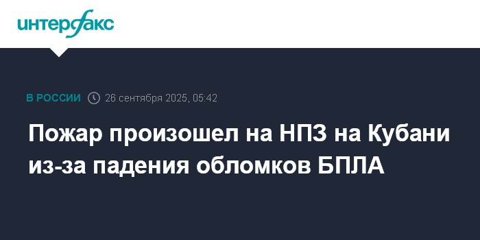 Москва. 26 сентября. INTERFAX.RU - В Краснодарском крае в результате падения обломков беспилотника начался пожар на нефтеперерабатывающем заводе, сообщает оперштаба региона.