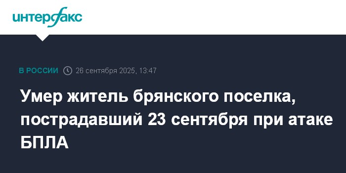 Москва. 26 сентября. INTERFAX.RU - Губернатор Брянской области Александр Богомаз сообщил о кончине местного жителя, получившего ранения в результате атаки беспилотников 23 сентября.