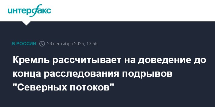 Москва. 26 сентября. INTERFAX.RU - Россия рассчитывает на то, что расследование подрывов "Северных потоков" будет доведено до конца, заявил на брифинге пресс-секретарь президента Дмитрий Песков.