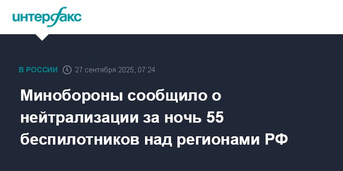 Москва. 27 сентября. INTERFAX.RU - Российские военные в течение прошедшей ночи нейтрализовали 55 беспилотников ВСУ над регионами страны, заявили в Минобороны РФ.