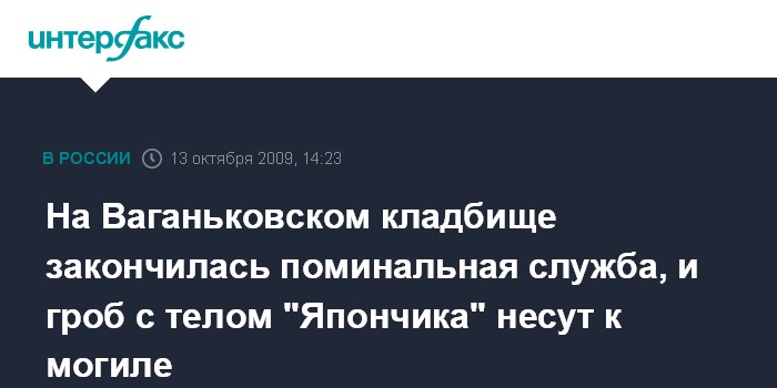 Москва. 13 октября. INTERFAX.RU – На Ваганьковском кладбище закончилась поминальная служба, гроб с телом криминального авторитета Вячеслава Иванькова, известного под кличкой "Япончик", его друзья и родственники несут к могиле, передает корреспондент "Интерфакса".