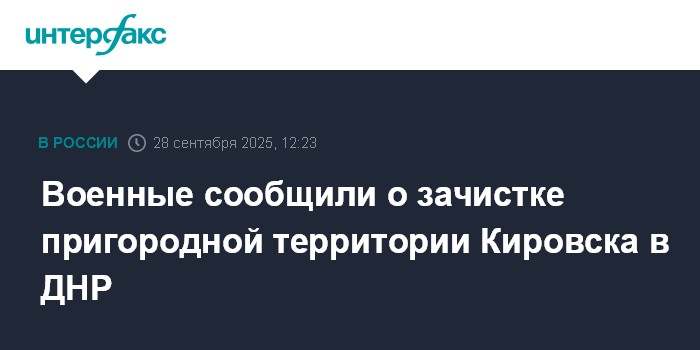 Москва. 28 сентября. INTERFAX.RU - Российские военные выполняют зачистку пригородной территории в районе Кировска в ДНР, заявили в Минобороны РФ в воскресенье.