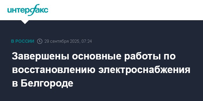 Москва. 29 сентября. INTERFAX.RU - В Белгороде и Белгородском районе выполнены основные работы по восстановлению электроснабжения после ракетного обстрела со стороны Украины, сообщил глава региона Вячеслав Гладков.