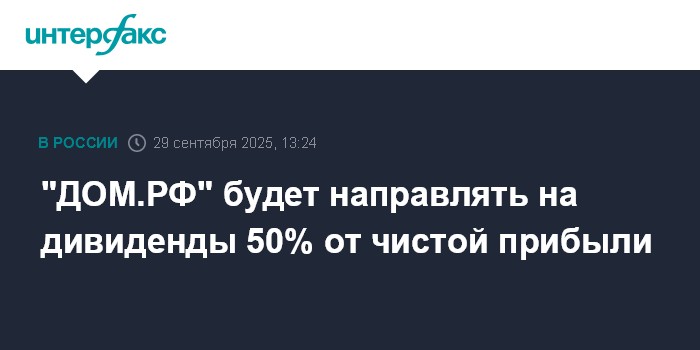 Москва. 29 сентября. INTERFAX.RU - Госкорпорация "ДОМ.РФ", которая в конце ноября готовится провести IPO, нацелена выплачивать дивиденды в размере 50% от чистой прибыли, заявил на Форуме розничных инвесторов директор по рынкам капитала "ДОМ.РФ" Александр Талачев.