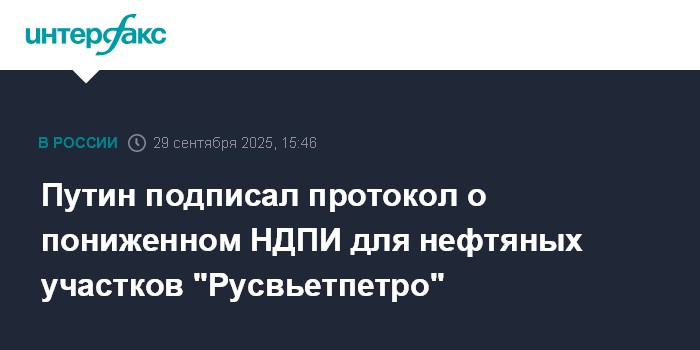 Москва. 29 сентября. INTERFAX.RU - Президент Владимир Путин подписал протокол с изменениями к межправительственному соглашению России и Вьетнама по работе совместной компании "Русвьетпетро", с 1 января 2026 года на нескольких ее участках в НАО будет введена льгота по НДПИ (коэффициент 0,6). Документ опубликован на официальном портале правовой информации.