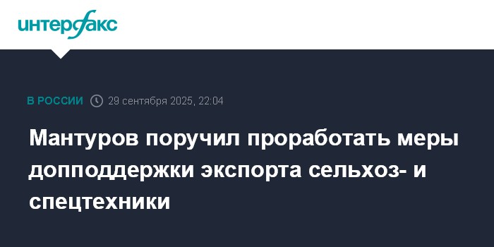 Москва. 29 сентября. INTERFAX.RU - Минпромторг, Минсельхоз и Минфин совместно с Банком России проработают меры дополнительной поддержки экспорта продукции российских производителей сельскохозяйственной и специальной техники.