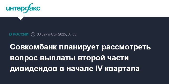Москва. 30 сентября. INTERFAX.RU - Совкомбанк собирается рассмотреть вопрос выплаты второй части дивидендов за 2024 год в начале IV квартала 2025 года.