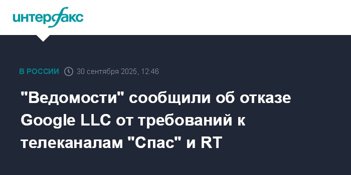 "Ведомости" сообщили об отказе Google LLC от требований к телеканалам "Спас" и RT
