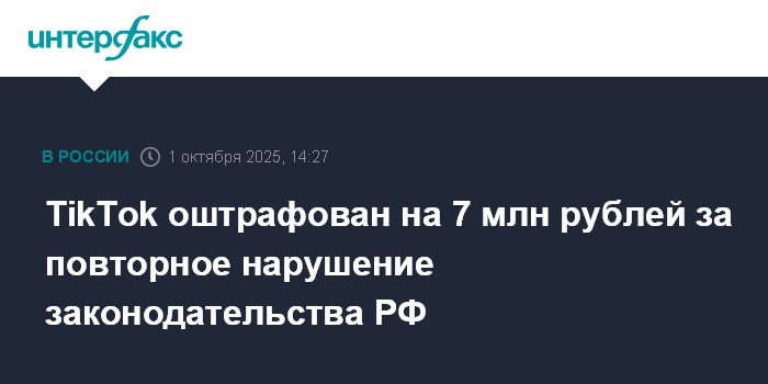 TikTok оштрафован на 7 млн рублей за повторное нарушение законодательства РФ