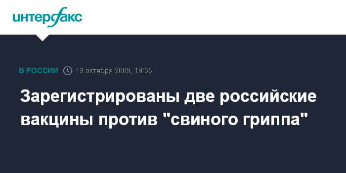Москва. 13 октября. INTERFAX.RU - В России официально зарегистрировано две отечественные вакцины против свиного гриппа, заявили в Федеральной службе по надзору в сфере здравоохранения и социального развития РФ (Росздравнадзор).